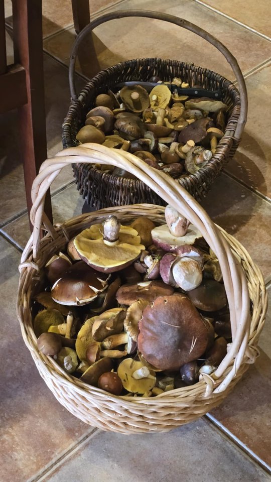 „Prisirinkome tikrai daug – net keturias pintines! Į kadrą tilpo tik dvi. Radome baravykų, šilbaravykių, kazlėkų ir įvairių kitų grybų. Šiandien juos valome ir ruošiamės marinuoti, o vakar sėkmingai išsikepėme baravykus su prieskoniais – buvo labai skanu.