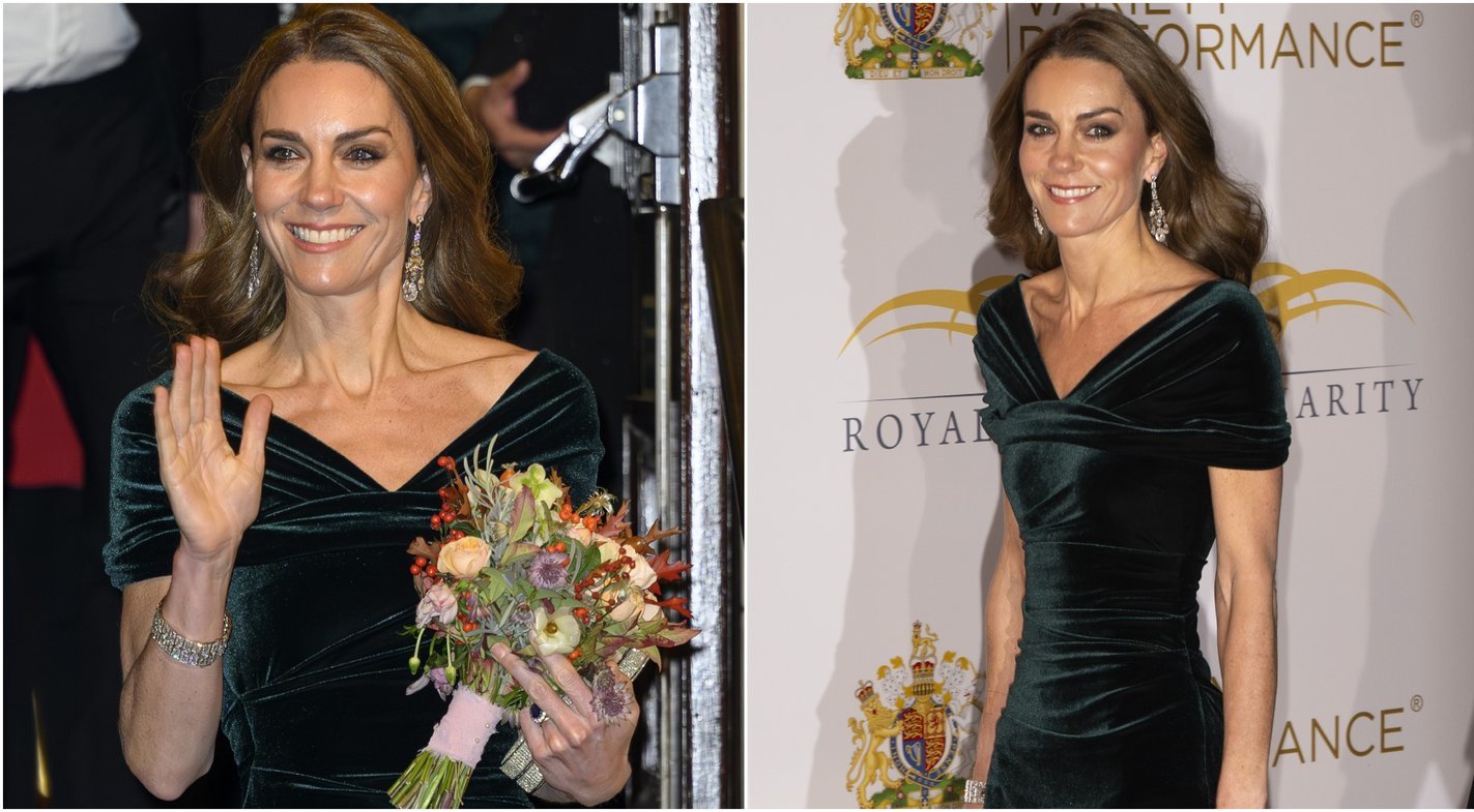 Kate pasirinko įspūdingą smaragdų spalvos aksominę suknelę, kuri, kaip manoma, yra iš „Talbot Runhof“ mados namų.