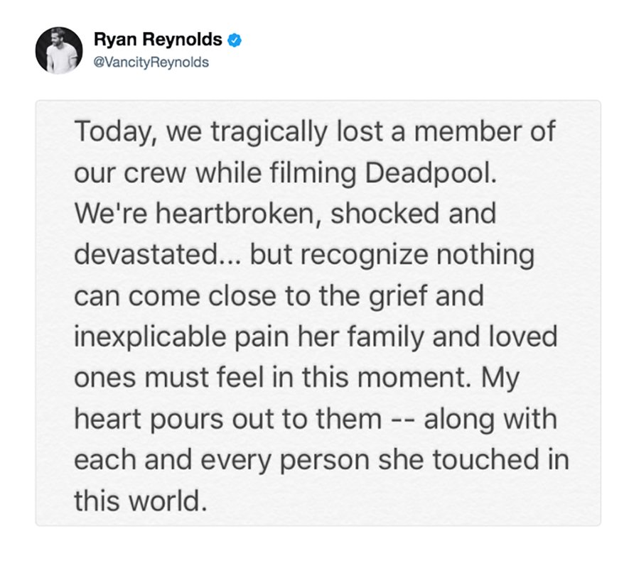 Ši tragedija sukrėtė visą „Deadpool“ kūrėjų komandą. Čia besifilmuojantis Holivudo aktorius Ryanas Reynoldsas viešai paskelbė užuojautą žuvusios kaskadininkės šeimai.