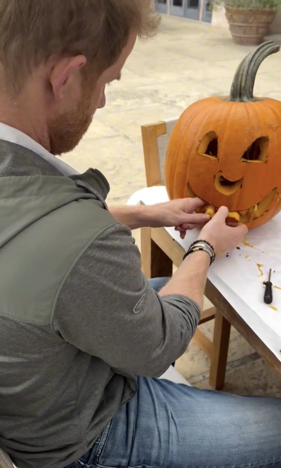 Meghan taip pat pasidalijo pagreitintu vaizdo įrašu savo „Instagram“ istorijoje, kuriame matyti, kaip Harry kruopščiai skaptuoja moliūgą – pažymi markeriu, išpjauna ir galiausiai parodo džiugiai besišypsantį moliūgą. Kaip ir anksčiau, Meghan pasirūpino vaikų privatumu – jų veidai vaizdo įraše nerodomi.