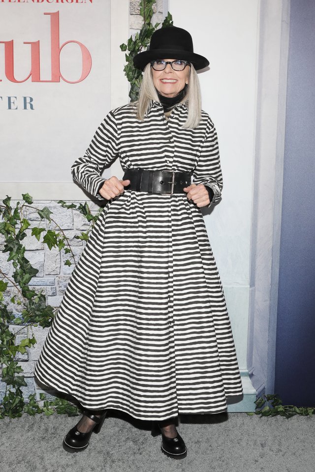 Tuomet Keaton vilkėjo languotą kostiumą, plačią diržo sagtį ir juodą fedora stiliaus skrybėlę. Ji atrodė puikiai nusiteikusi – pozavo nuotraukoms su svečiais, keldama šampano taurę.