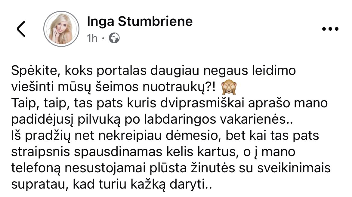 Ketvirtadienį vienas naujienų portalas publikavo straipsnį, kuriame rašoma apie neva pasklidusias kalbas dėl ketvirtojo I. Stumbrienės nėštumo.