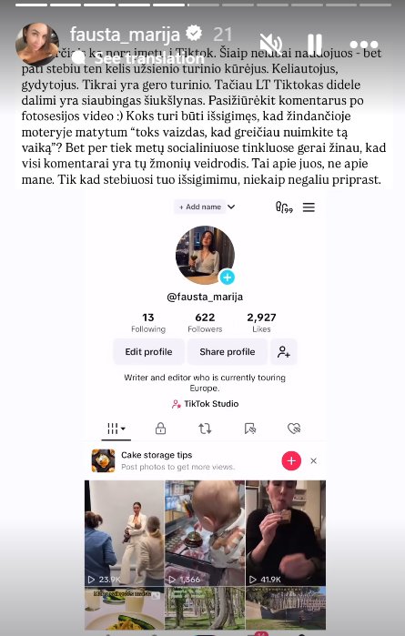 „Retkarčiais ką nors įmetu į „TikTok“. Šiaip nelabai naudojuos, bet pati stebiu ten kelis užsienio turinio kūrėjus. Kelautojus, gydytojus. Tikrai yra gero turinio. Tačiau lietuviškas „TikTok“ didele dalimi yra tiesiog siaubingas šiukšlynas.