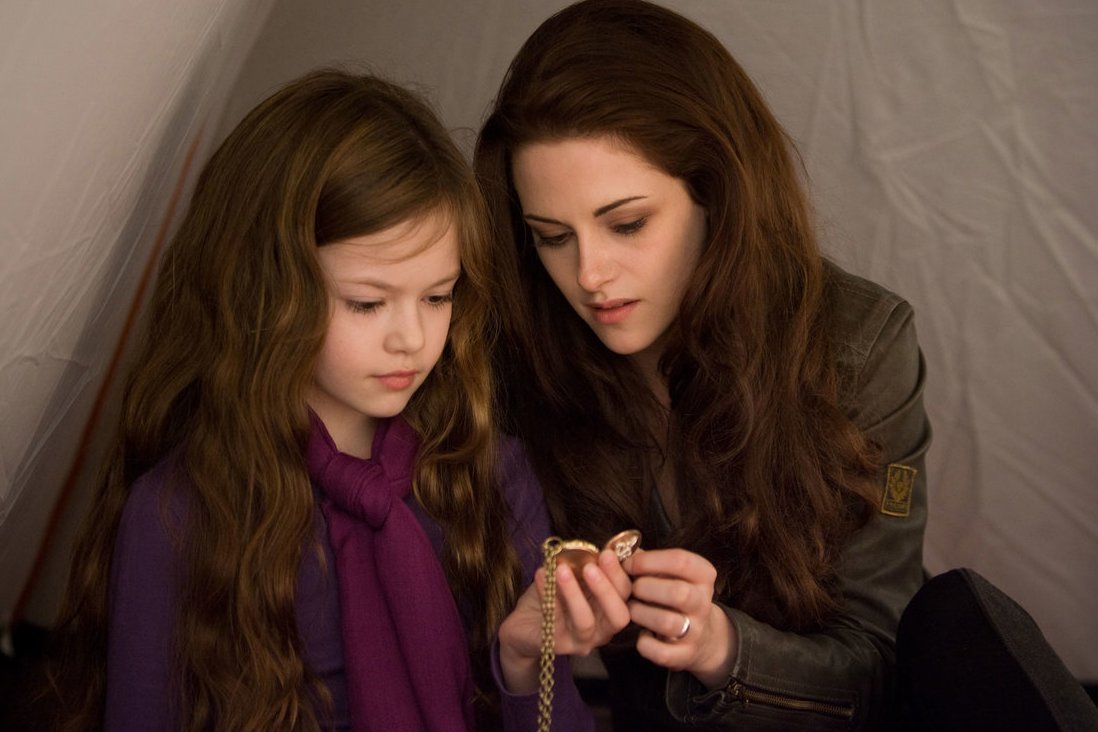 Paskutinėje filmo dalyje pagrindinė kino juostos pora susilaukia mergaitės Renesmės. Ypatingo grožio vaikas turi ir magiškų galių – geba komunikuoti, perduodant atminties vaizdus. Neįprastas personažas atiteko aktorei M. Foy.