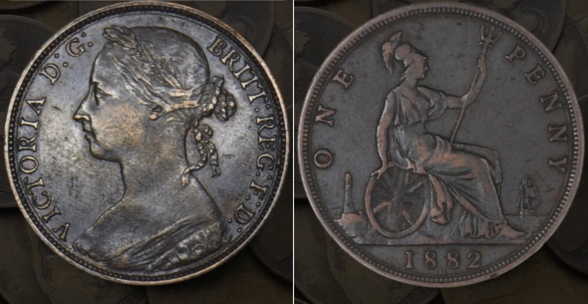 Paskui atkreipęs dėmesį į antrąją monetą, naudotojas paaiškino: „Tai 1882 m. H nominalo centas iš Jungtinės Karalystės. Skirtingai nuo kitų atmainų, šio cento H kalyklos ženklas yra po data, o ne kairėje pusėje. H raidė yra labai maža, todėl būtinai naudokite mikroskopą, nes ji taip pat gali labai nusidėvėti. Averso pusėje pavaizduota jauna karalienės Viktorijos galva“.
