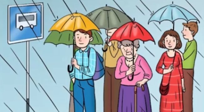 „Moteris su raudona suknele neturi skėčio, bet vis tiek neatrodo sušlapusi“, – pastebėjo vienas komentatorius. Pasirodo, atrodo, lyg ji laikytų skėtį, tačiau iš tiesų šis priklauso už jos stovinčiam žmogui. Būtent dėl šio vizualinio efekto žiūrovams susidaro įspūdis, kad lietus jos visai nepaliečia.