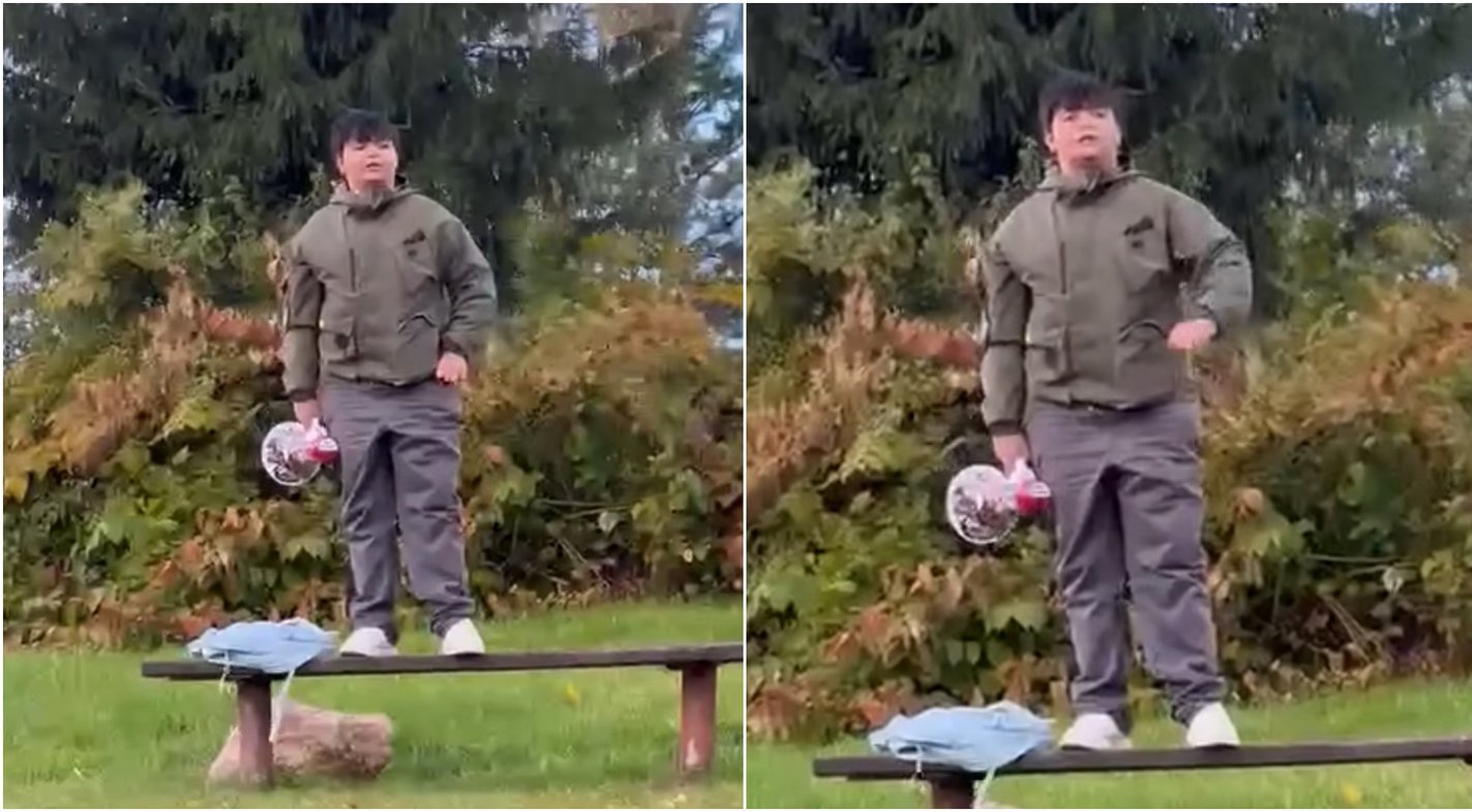 Užfiksuotame įraše matyti, kaip ant suoliuko užlipęs komandos sirgalius, rankoje laikydamas megafoną, garsiai traukia skanduotę.