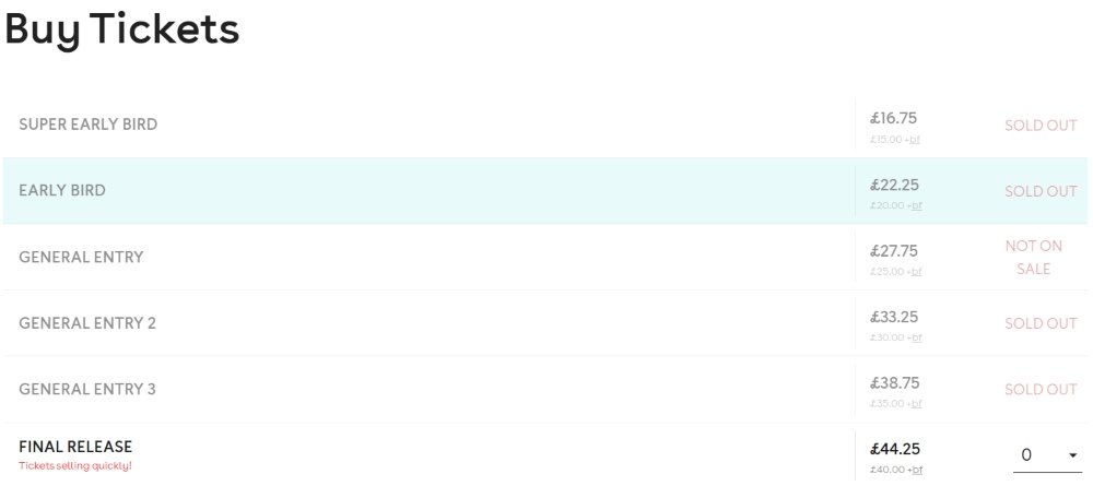 Pagal pateiktą informaciją internetinėje svetainėje, ankstesnių kategorijų bilietai jau yra išparduoti, o likusių brangiausių bilietų kaina – 44,25 svarų (apie 50,5 Eur).